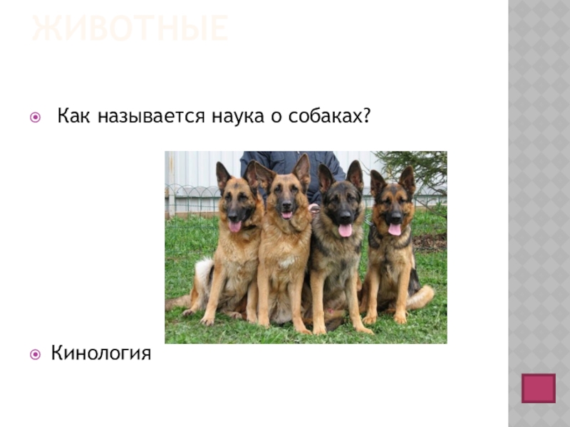 ЖИВОТНЫЕ  Как называется наука о собаках? Кинология