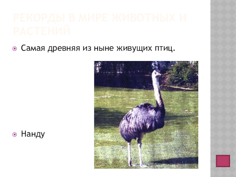 РЕКОРДЫ В МИРЕ ЖИВОТНЫХ И РАСТЕНИЙСамая древняя из ныне живущих птиц. Нанду