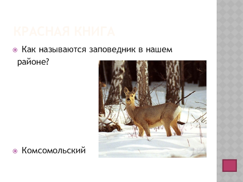 КРАСНАЯ КНИГАКак называются заповедник в нашем районе?Комсомольский