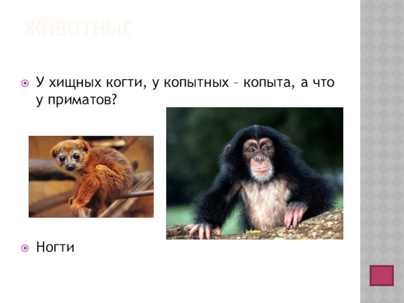 ЖИВОТНЫЕ У хищных когти, у копытных – копыта, а что у приматов? Ногти