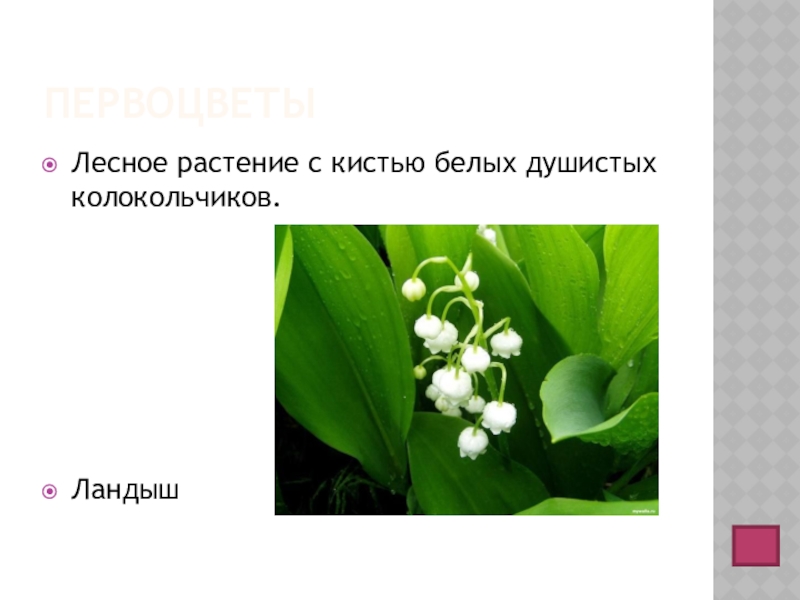 ПЕРВОЦВЕТЫЛесное растение с кистью белых душистых колокольчиков. Ландыш