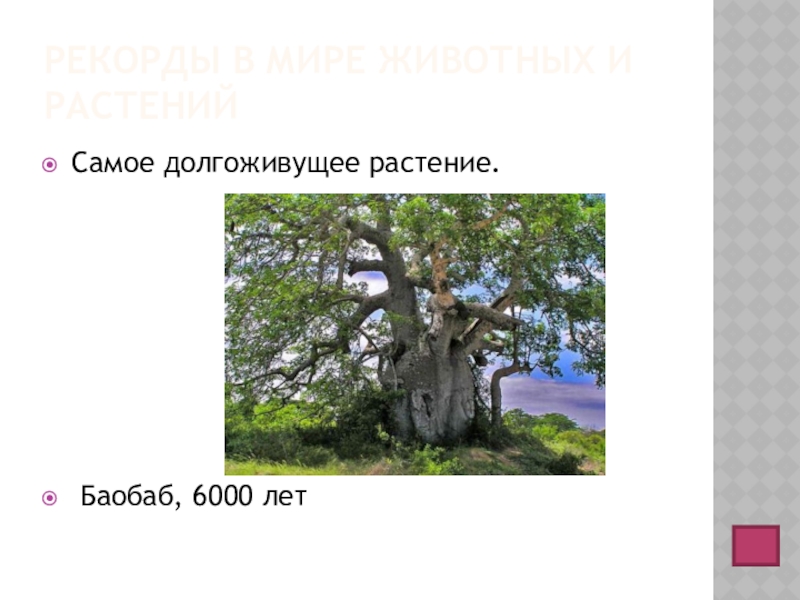 РЕКОРДЫ В МИРЕ ЖИВОТНЫХ И РАСТЕНИЙСамое долгоживущее растение. Баобаб, 6000 лет