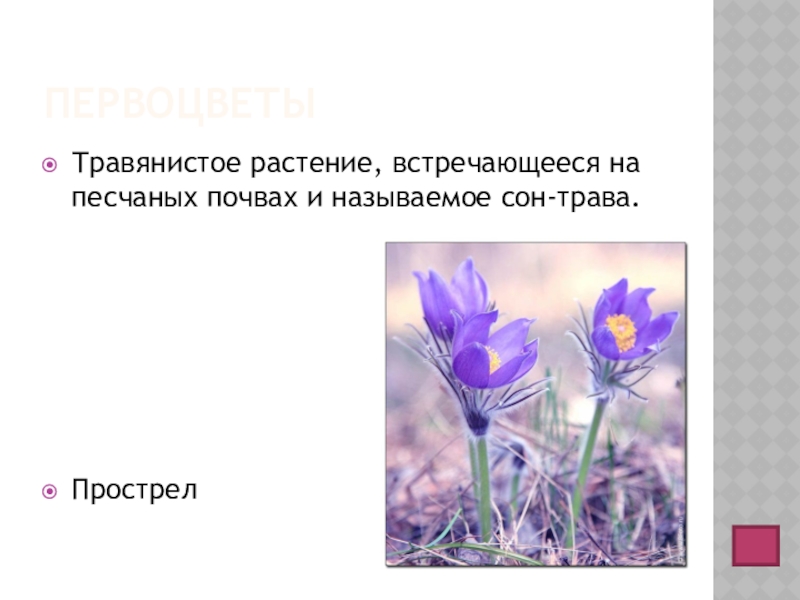 ПЕРВОЦВЕТЫТравянистое растение, встречающееся на песчаных почвах и называемое сон-трава.Прострел