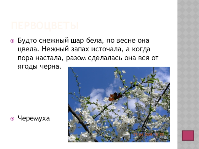 ПЕРВОЦВЕТЫБудто снежный шар бела, по весне она цвела. Нежный запах источала, а когда пора настала, разом сделалась