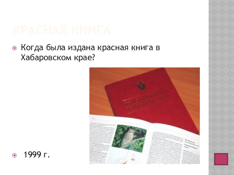 КРАСНАЯ КНИГАКогда была издана красная книга в Хабаровском крае? 1999 г.