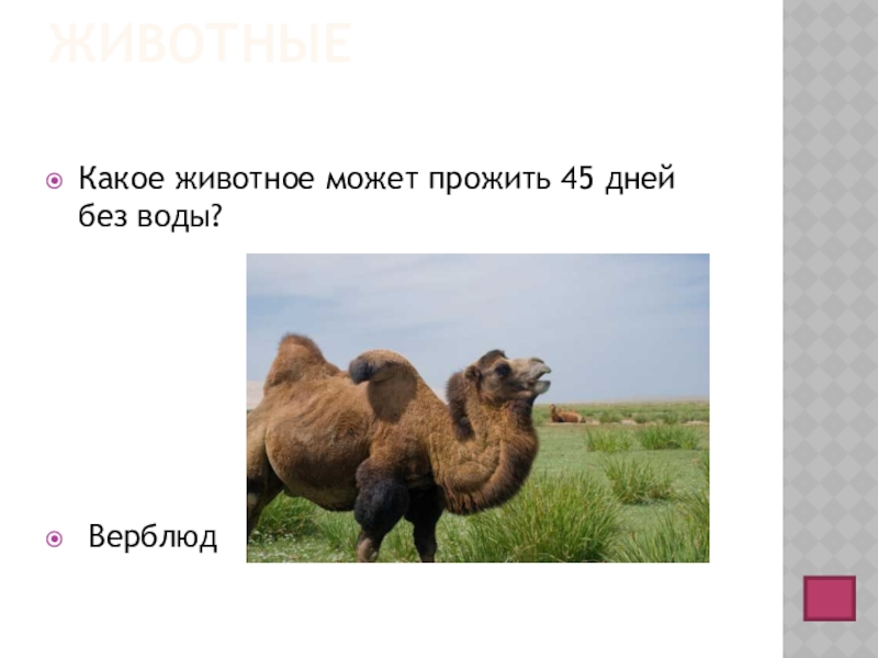 ЖИВОТНЫЕ Какое животное может прожить 45 дней без воды? Верблюд