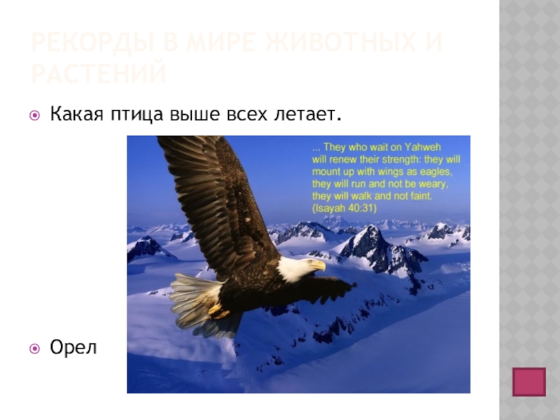 РЕКОРДЫ В МИРЕ ЖИВОТНЫХ И РАСТЕНИЙКакая птица выше всех летает.Орел