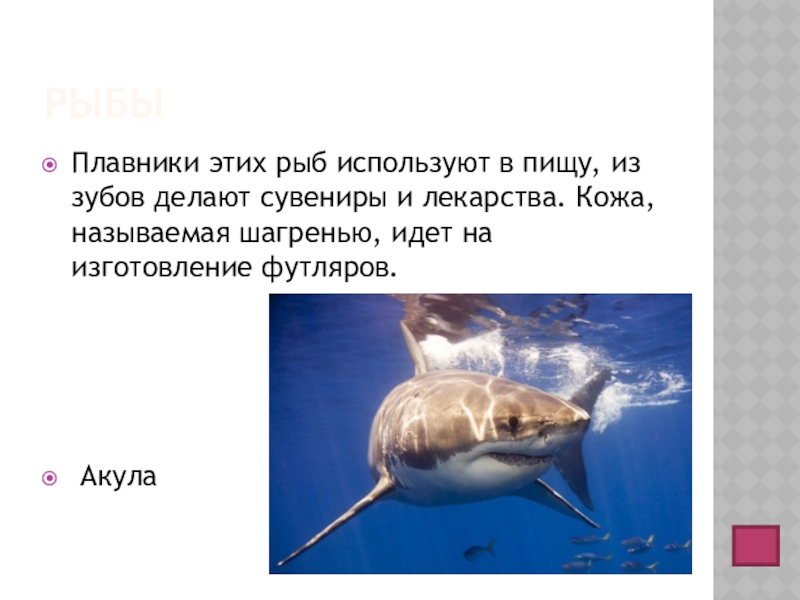 РЫБЫПлавники этих рыб используют в пищу, из зубов делают сувениры и лекарства. Кожа, называемая шагренью, идет на