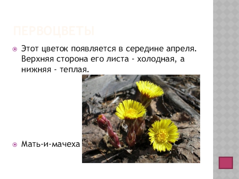 ПЕРВОЦВЕТЫЭтот цветок появляется в середине апреля. Верхняя сторона его листа - холодная, а нижняя - теплая. Мать-и-мачеха