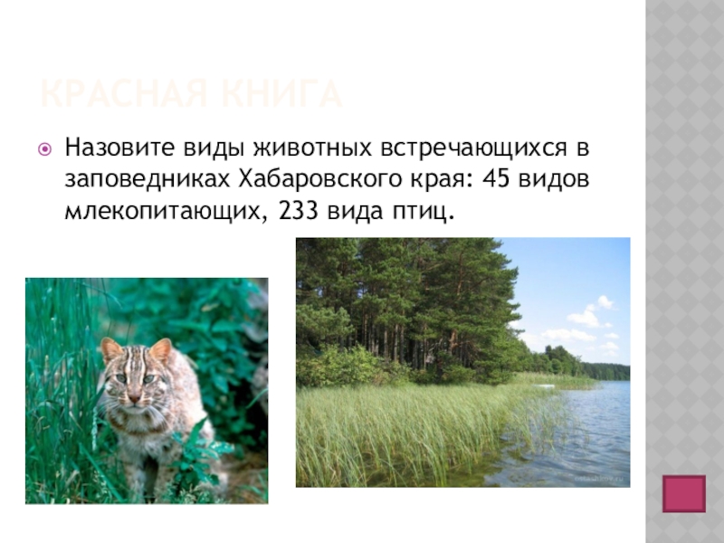 КРАСНАЯ КНИГАНазовите виды животных встречающихся в заповедниках Хабаровского края: 45 видов млекопитающих, 233 вида птиц.