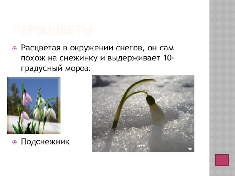 ПЕРВОЦВЕТЫРасцветая в окружении снегов, он сам похож на снежинку и выдерживает 10-градусный мороз.Подснежник