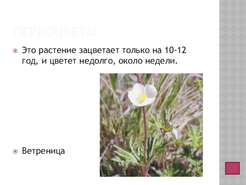 ПЕРВОЦВЕТЫЭто растение зацветает только на 10-12 год, и цветет недолго, около недели.Ветреница