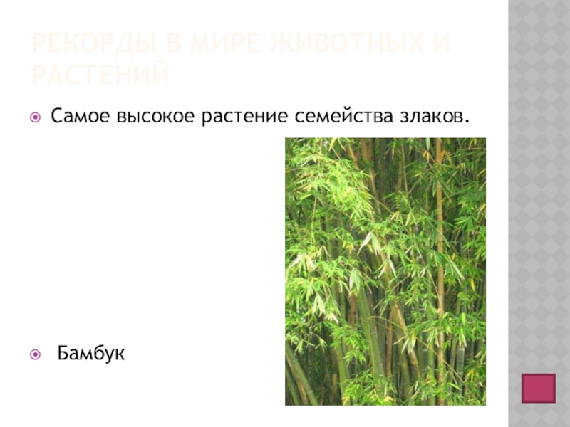 РЕКОРДЫ В МИРЕ ЖИВОТНЫХ И РАСТЕНИЙСамое высокое растение семейства злаков. Бамбук
