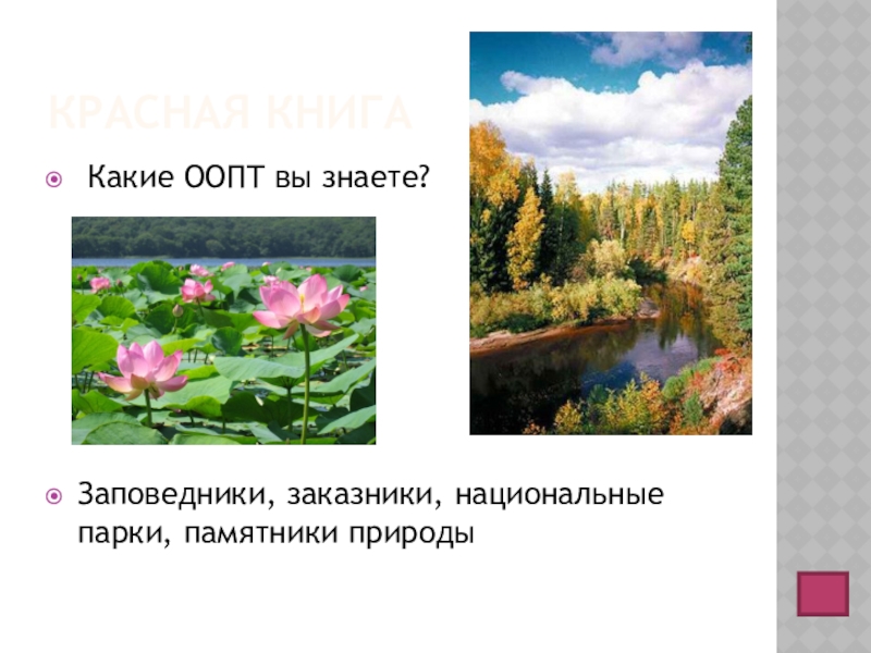 КРАСНАЯ КНИГА Какие ООПТ вы знаете?Заповедники, заказники, национальные парки, памятники природы