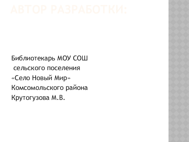 АВТОР РАЗРАБОТКИ: Библиотекарь МОУ СОШ сельского поселения «Село Новый Мир» Комсомольского районаКрутогузова М.В.