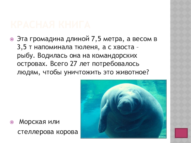 напоминала тюленя, а с хвоста – рыбу. Водилась она на командорских островах. Всего 27 лет потребовалось людям, чтобы уничтожить это животное?