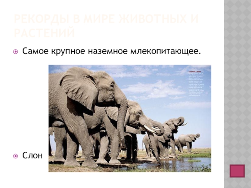 РЕКОРДЫ В МИРЕ ЖИВОТНЫХ И РАСТЕНИЙСамое крупное наземное млекопитающее. Слон