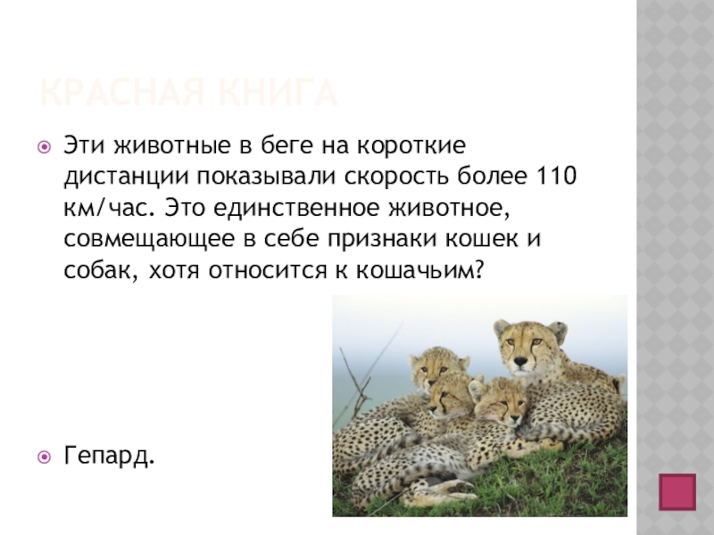 КРАСНАЯ КНИГАЭти животные в беге на короткие дистанции показывали скорость более 110 км/час. Это единственное животное, совмещающее