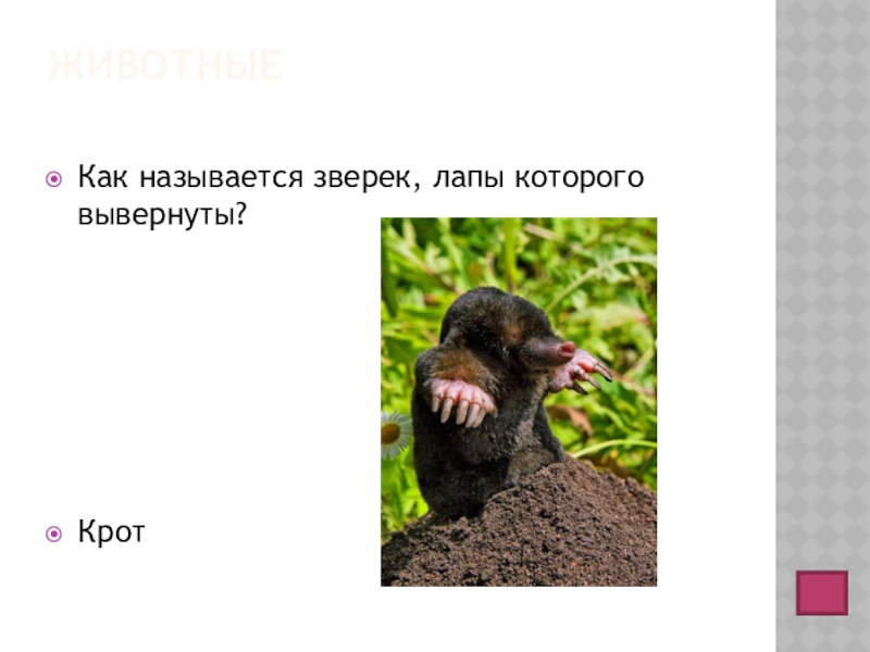 ЖИВОТНЫЕ Как называется зверек, лапы которого вывернуты? Крот