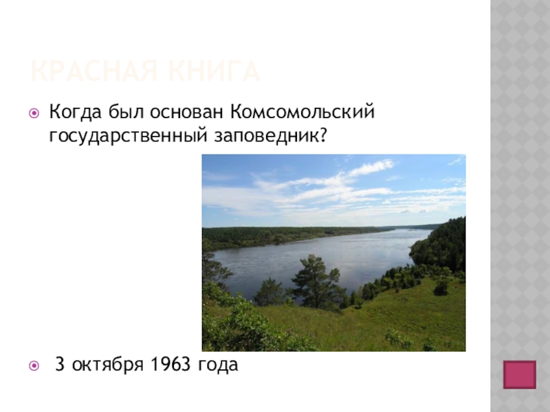 КРАСНАЯ КНИГАКогда был основан Комсомольский государственный заповедник? 3 октября 1963 года