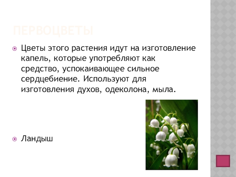 ПЕРВОЦВЕТЫЦветы этого растения идут на изготовление капель, которые употребляют как средство, успокаивающее сильное сердцебиение. Используют для изготовления