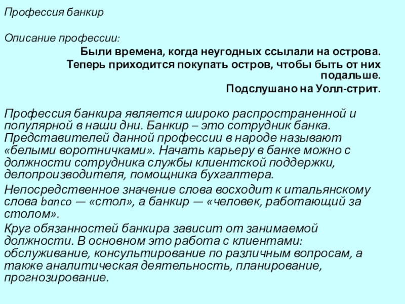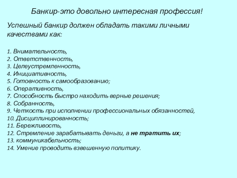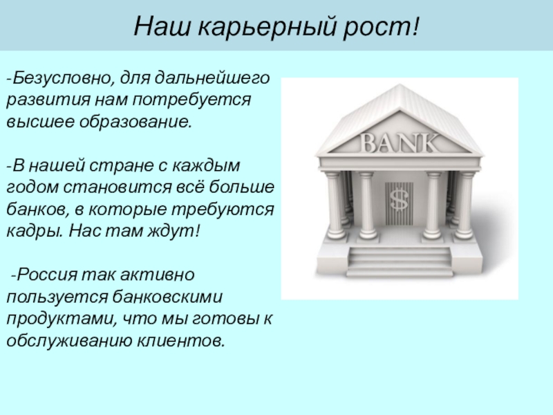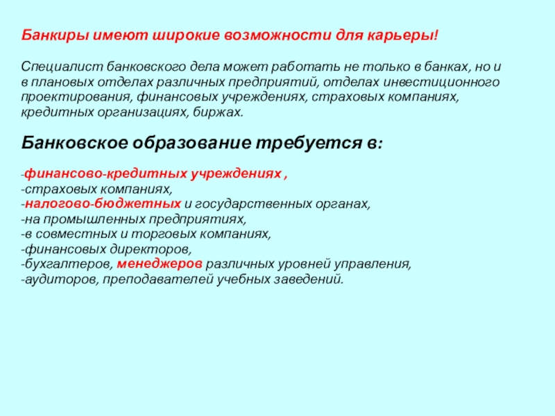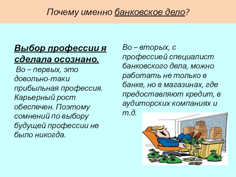 Во – вторых, с профессией специалист банковского дела, можно работать не только в банке, но в магазинах, где предоставляют кредит, в аудиторских компаниях и т.д.