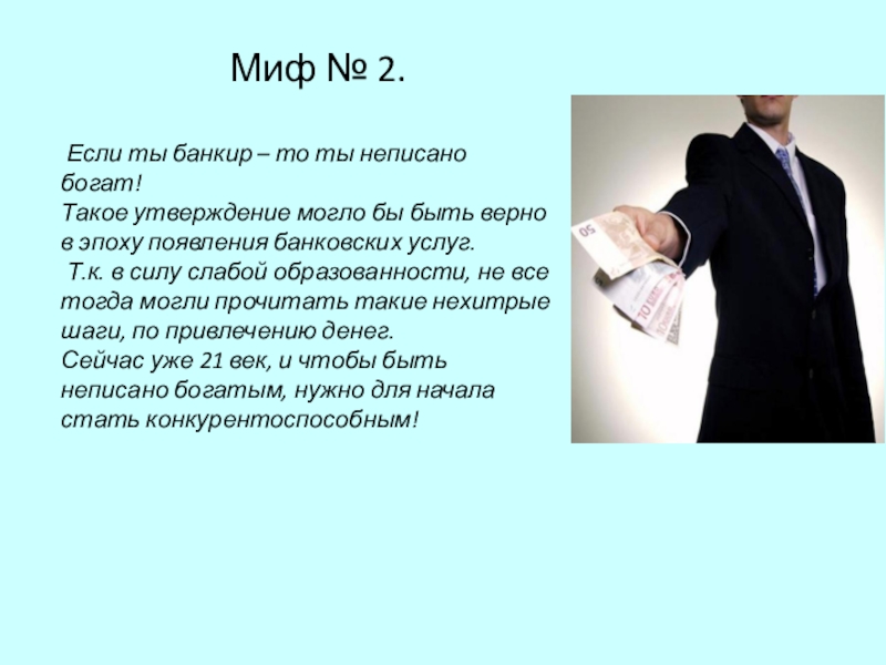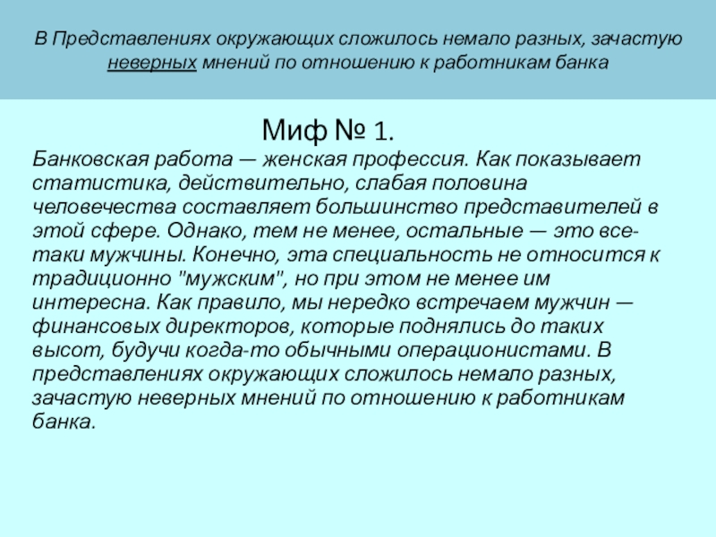 Банковская работа — женская профессия. Как показывает статистика, действительно, слабая половина человечества составляет большинство представителей в этой сфере. Однако, тем не менее, остальные — это все-таки мужчины. Конечно, эта специальность не относится к традиционно "мужским", но при этом не менее им интересна. Как правило, мы нередко встречаем мужчин — финансовых директоров, которые поднялись до таких высот, будучи когда-то обычными операционистами. В представлениях окружающих сложилось немало разных, зачастую неверных мнений по отношению к работникам банка.