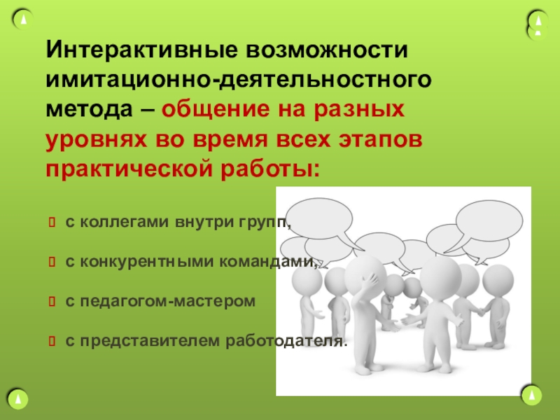 Интерактивные возможности имитационно-деятельностного метода – общение на разных уровнях во время всех этапов практической работы: