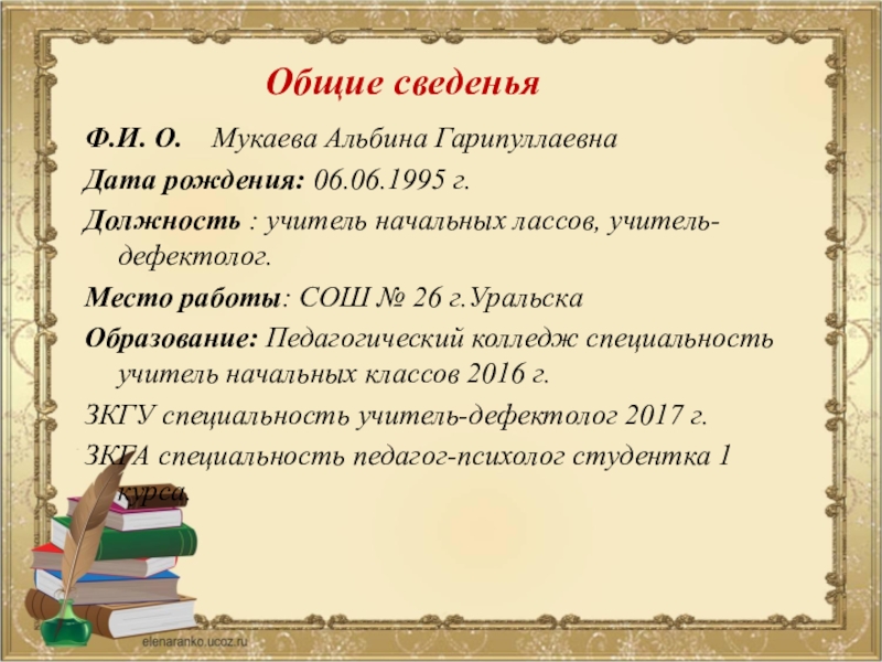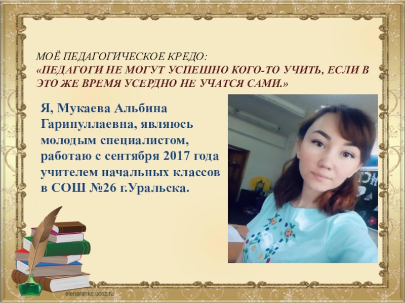 Я, Мукаева Альбина Гарипуллаевна, являюсь молодым специалистом, работаю с сентября 2017 года учителем начальных классов в СОШ №26 г.Уральска.