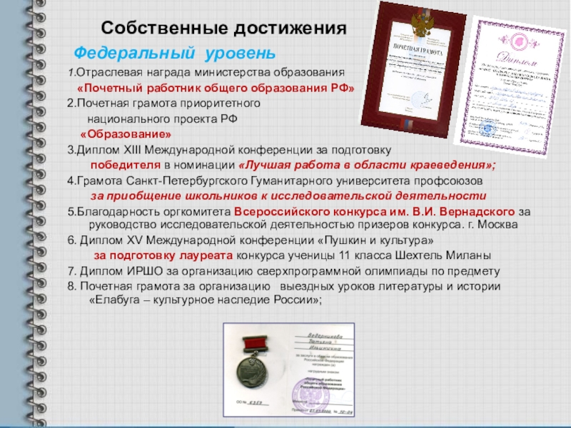 8. Почетная грамота за организацию выездных уроков литературы и истории «Елабуга – культурное наследие России»;