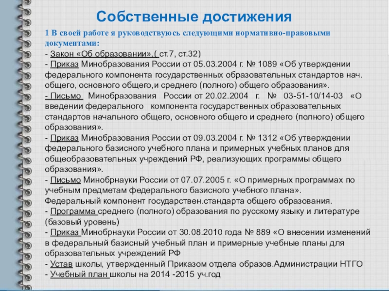 - Приказ Минобразования России от 05.03.2004 г. № 1089 «Об утверждении федерального компонента государственных образовательных стандартов нач. общего, основного общего,и среднего (полного) общего образования».