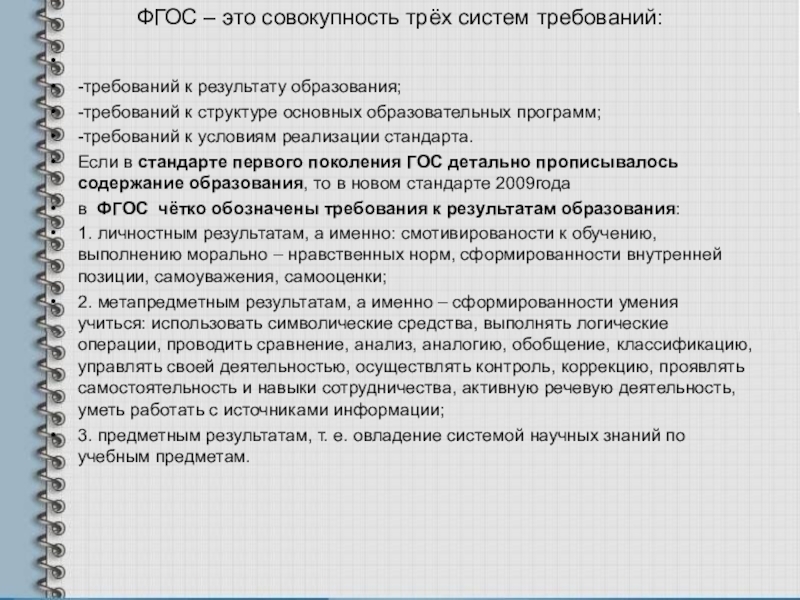 Слайд 42ФГОС – это совокупность трёх систем требований: