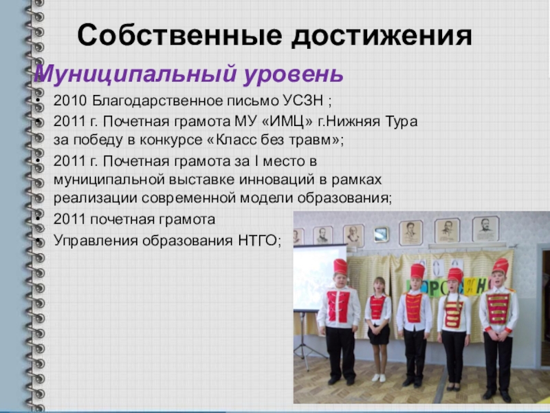2011 г. Почетная грамота за I место в муниципальной выставке инноваций в рамках реализации современной модели образования;