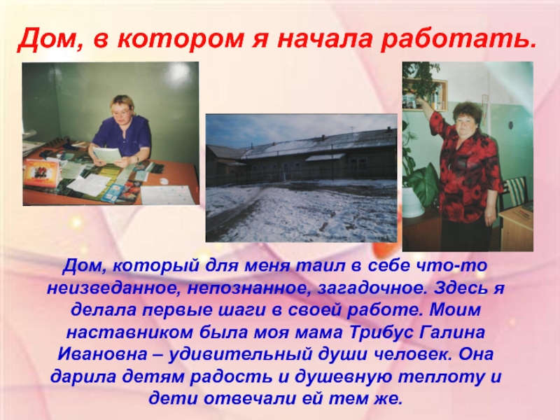 себе что-то неизведанное, непознанное, загадочное. Здесь я делала первые шаги в своей работе. Моим наставником была моя мама Трибус Галина Ивановна – удивительный души человек. Она дарила детям радость и душевную теплоту и дети отвечали ей тем же.