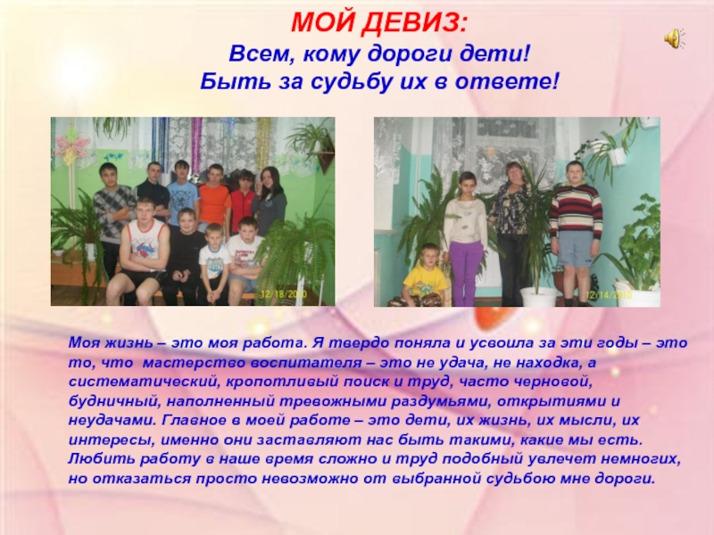 – это моя работа. Я твердо поняла и усвоила за эти годы – это то, что мастерство воспитателя – это не удача, не находка, а систематический, кропотливый поиск и труд, часто черновой, будничный, наполненный тревожными раздумьями, открытиями и неудачами. Главное в моей работе – это дети, их жизнь, их мысли, их интересы, именно они заставляют нас быть такими, какие мы есть.