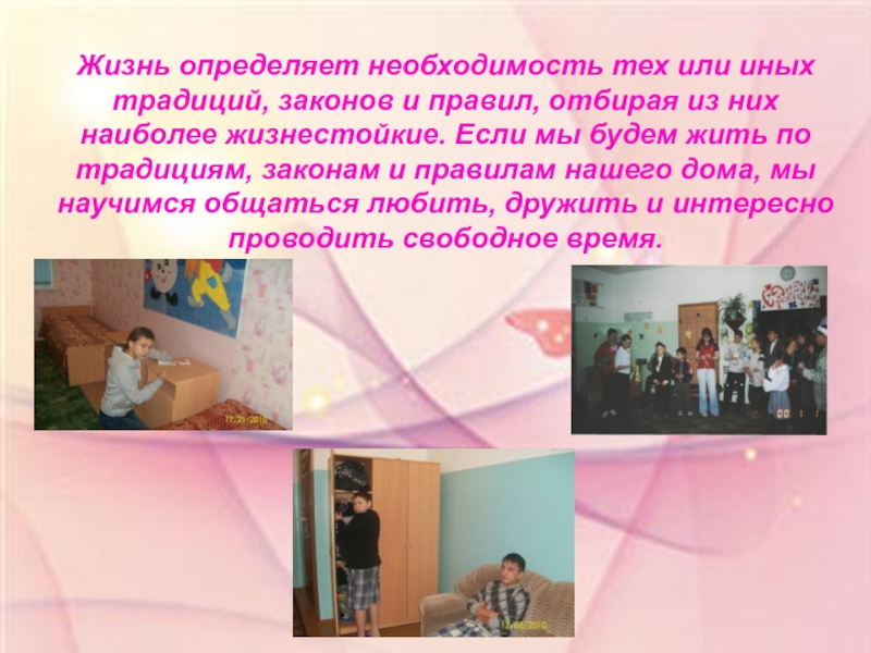 из них наиболее жизнестойкие. Если мы будем жить по традициям, законам и правилам нашего дома, мы научимся общаться любить, дружить и интересно проводить свободное время.
