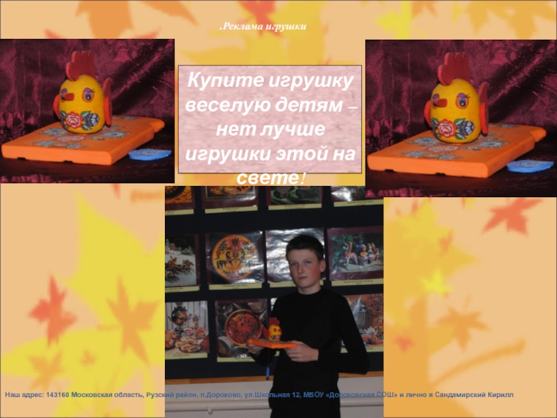 Наш адрес: 143160 Московская область, Рузский район, п.Дорохово, ул.Школьная 12, МБОУ «Дороховская СОШ» и лично я Сандамирский Кирилл