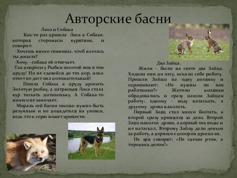 Жили – были на свете два Зайца. Ходили они по лесу, искали себе работу. Пришли Зайцы на одну полянку и спрашивают: «Не нужны ли вам работники?» Жители полянки обрадовались и сразу нашли Зайцам работу: одному - воду натаскать, а другому- дрова наколоть.