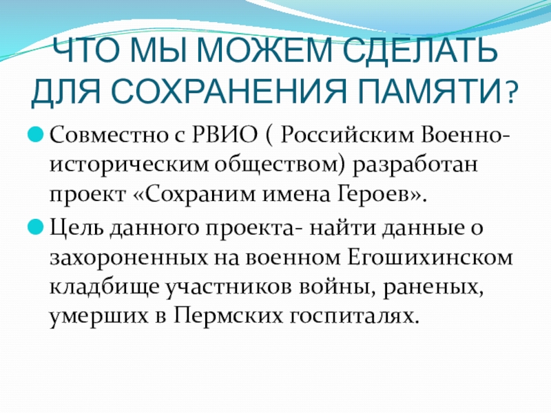 ЧТО МЫ МОЖЕМ СДЕЛАТЬ ДЛЯ СОХРАНЕНИЯ ПАМЯТИ?Совместно с РВИО ( Российским Военно-историческим обществом) разработан проект «Сохраним имена
