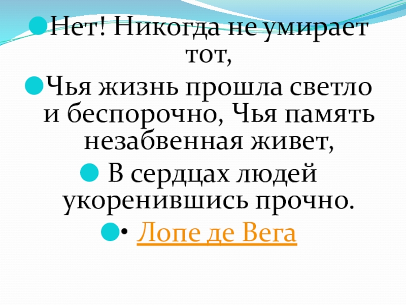 Нет! Никогда не умирает тот, Чья жизнь прошла светло и беспорочно, Чья память незабвенная живет, В сердцах