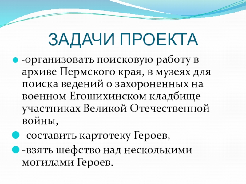 ЗАДАЧИ ПРОЕКТА-организовать поисковую работу в архиве Пермского края, в музеях для поиска ведений о захороненных на военном