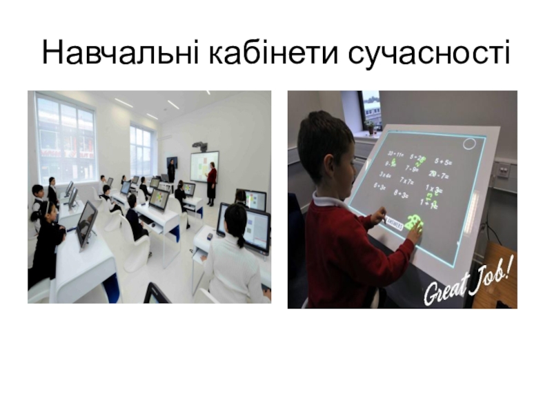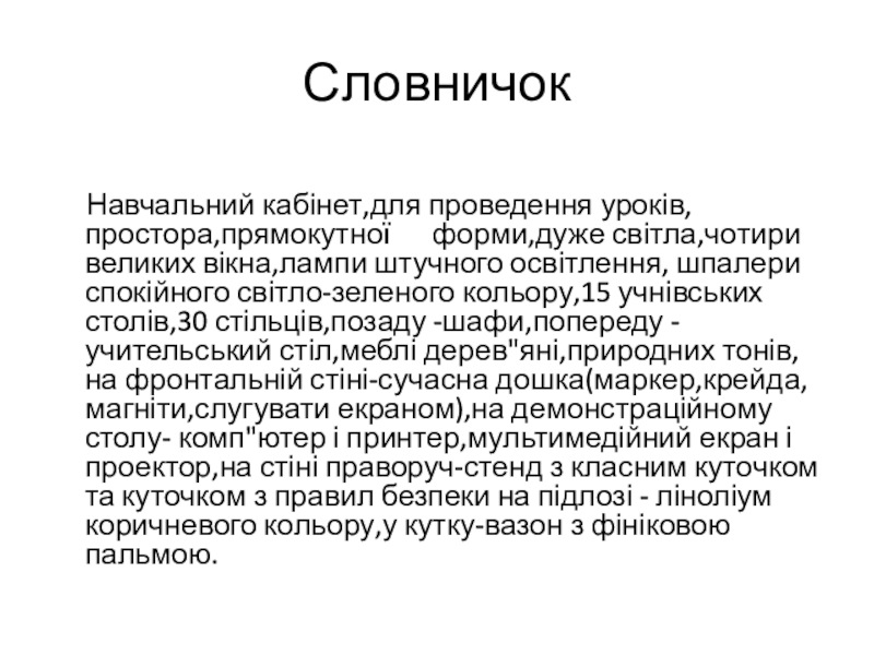 Словничок    Навчальний кабінет,для проведення уроків,простора,прямокутної   форми,дуже світла,чотири великих вікна,лампи штучного освітлення, шпалери спокійного