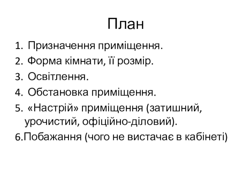 План1.	Призначення приміщення.2.	Форма кімнати, її розмір.3.	Освітлення.4.	Обстановка приміщення.5.	«Настрій» приміщення (затишний, урочистий, офіційно-діловий).6.Побажання (чого не вистачає в кабінеті)