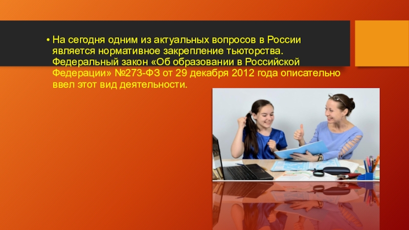 тьюторства. Федеральный закон «Об образовании в Российской Федерации» №273-ФЗ от 29 декабря 2012 года описательно ввел этот вид деятельности.