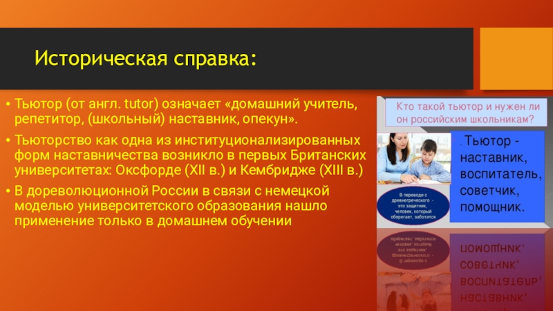 Историческая справка:Тьютор (от англ. tutor) означает «домашний учитель, репетитор, (школьный) наставник, опекун».Тьюторство как одна из институционализированных форм