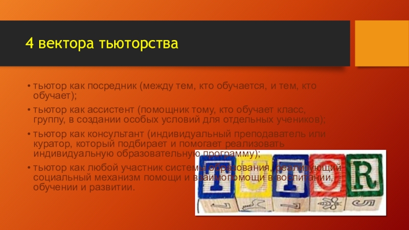 4 вектора тьюторстватьютор как посредник (между тем, кто обучается, и тем, кто обучает);тьютор как ассистент (помощник тому,