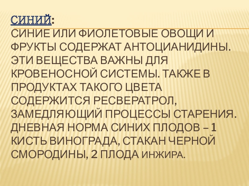 важны для кровеносной системы. Также в продуктах такого цвета содержится ресвератрол, замедляющий процессы старения. Дневная норма синих плодов – 1 кисть винограда, стакан черной смородины, 2 плода инжира.