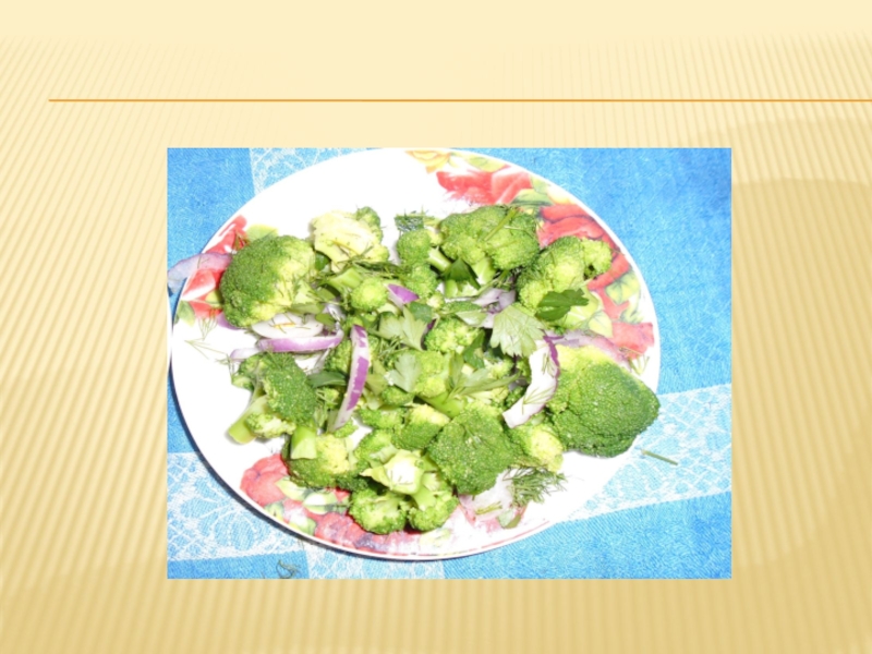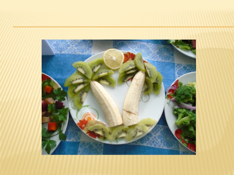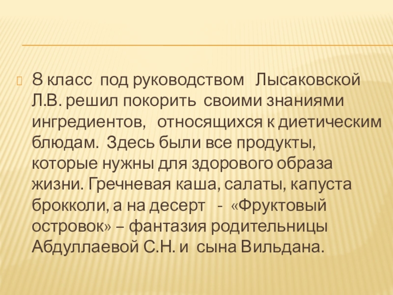ингредиентов, относящихся к диетическим блюдам. Здесь были все продукты, которые нужны для здорового образа жизни. Гречневая каша, салаты, капуста брокколи, а на десерт - «Фруктовый островок» – фантазия родительницы Абдуллаевой С.Н. и сына Вильдана.