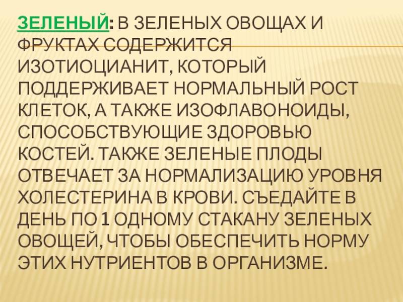 нормальный рост клеток, а также изофлавоноиды, способствующие здоровью костей. Также зеленые плоды отвечает за нормализацию уровня холестерина в крови. Съедайте в день по 1 одному стакану зеленых овощей, чтобы обеспечить норму этих нутриентов в организме.