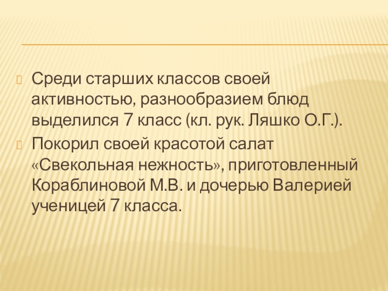 Слайд 17Среди старших классов своей активностью, разнообразием блюд выделился 7 класс (кл.